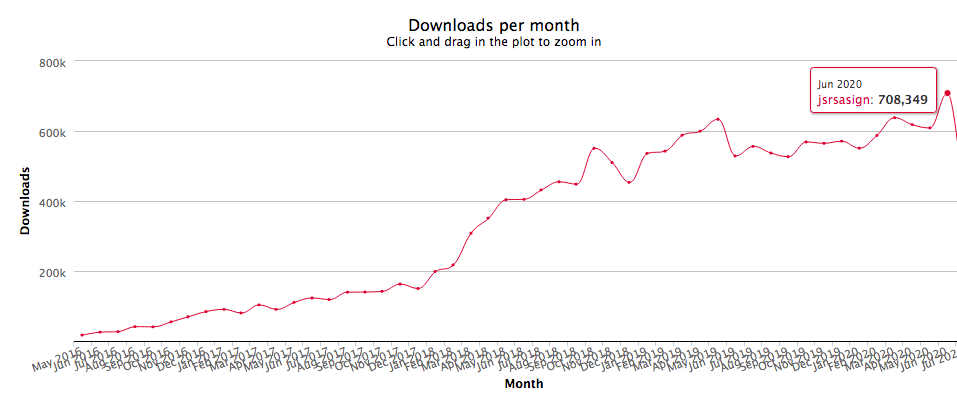 自分の趣味でやってる調査のために開発したライブラリですが、Node.JSのパッケージ npm で公開した2015年あたりから利用者ダウンロードが増えています。github.comからのダウンロードや、勝手に行われている公開CDNからの利用もあると思いますが、npmパッケージのダウンロード数だけでいうとnpm-stat.comさんのダウンロード数グラフを見てみるに、2018年あたりからブリブリ増えてしまっており、2019年あたりからサチりはじめ、それでも最近の月間ダウンロードは60万件超、先月は70万を超えてしまいました。npmでは他のパッケージの依存関係を書けるのですが、2020年7月現在で379ものnpmパッケージのプロジェクトがjsrsasignに依存していることがわかります。とほほ。