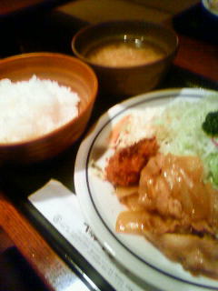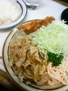 今日は飲んだ翌日だったので、ちょっとおなかが空いてしまい、フライ盛り合わせが食べたいなぁと神保町ムッシュの方に向かってみました。随分歩いたのにう〜〜ん無いみたい。なんでだろ。仕方なく、(時間も無いので)「肉屋の正直な食堂」で本当は春雨ヌードルみたいなのが食べたかったんだけど券売機の後ろの人のプレッシャーに負けてしまいテキトーに豚肉の韓国風炒めみたいなやつを食べました。